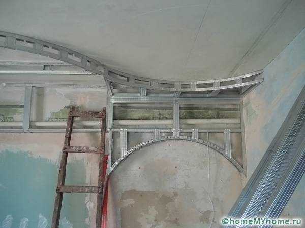 Направляющий и потолочный профилиЧасто нестандартные формы каркаса мастера изготавливают с обычных профилей, делая надрезы на их полках и изогнув рейку.