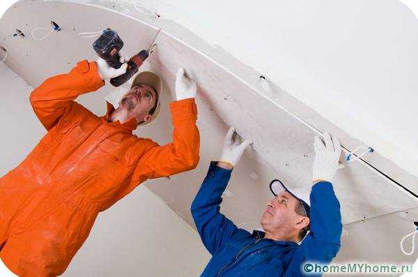 Далее, лист укладывают на каркас и осторожно изгибая, фиксируют его саморезами. Когда он высохнет, то без проблем сохранит необходимую конфигурацию. После того как второй уровень собран, проводят полную отделку поверхностей гипсовой штукатурной смесью. И также можно создать второй уровень потолка, используя в качестве первого несущий основной. Для этого проводят выравнивание перекрытия, на котором собирают каркас «второго» яруса.