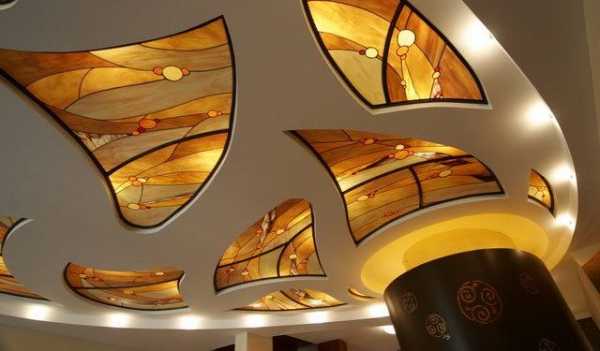 Удачно выглядит сочетание гипсокартона и таких декоративных элементов, как стекло с фотопечатью. Удачно подобранное изображение и подсветка подчеркнет стиль интерьера и поможет скорректировать пропорции пространства. Чрезвычайно оригинально смотрится дизайн комнаты с использованием витражных и зеркальных элементов. Свежо и интересно воспринимается двухуровневый потолок с декорированием одного из ярусов объемной росписью.