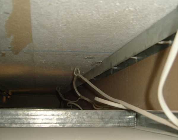 - Подвесы. Каркас обязательно соединяется с несущим перекрытием путем монтажа прямых подвесов и соединения их со стоечными профилями.