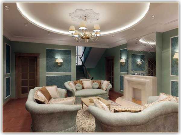 - Для гостиной особенно важно выбрать безупречное выполнение работы, чтобы зал мог подтвердить свое истинной лицо квартиры. Здесь можно использовать гипсокартонные потолки с несколькими уровнями и несколько видов освещения, например, люстру и несколько светильников.