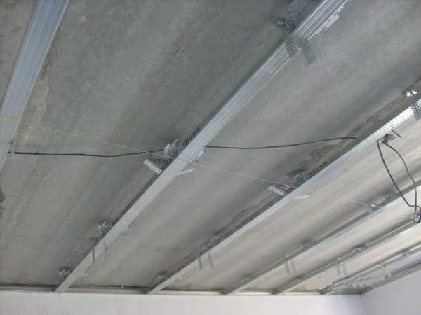 Монтаж потолка из гипсокартона начинают с установки металлических профилей, выравнивая их в один уровень. На этом этапе необходимо продумать размещение всех светильников и сделать к каждому из них проводку.