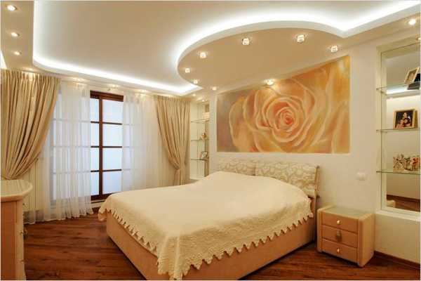 Потолки из гипсокартона по фото в спальне создаются в большинстве своем с использованием волнистых линий с плавными переходами. Отлично дополняет спальню подсветка, установленная в специальном каркасе, в таком случае даже, если выключен основной свет, атмосфера в комнате остается по-прежнему уютной.