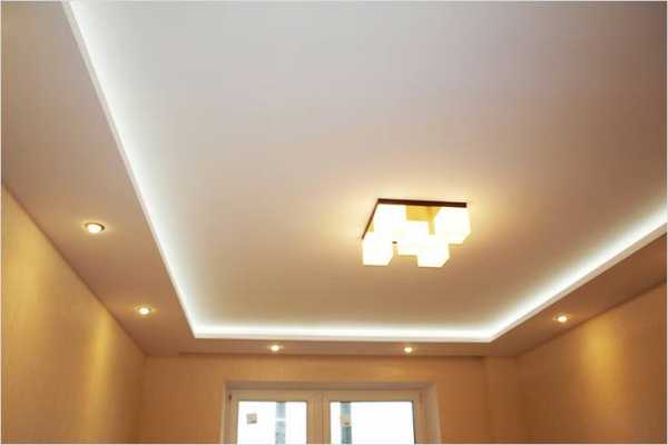 При опущении части потолка образуется пространство, благодаря которому появляется возможность установить софиты. Потолок из гипсокартона с подсветкой смотрится всегда красиво и оригинально. К тому же таким образом можно избавиться от необходимости установки громоздкой люстры.