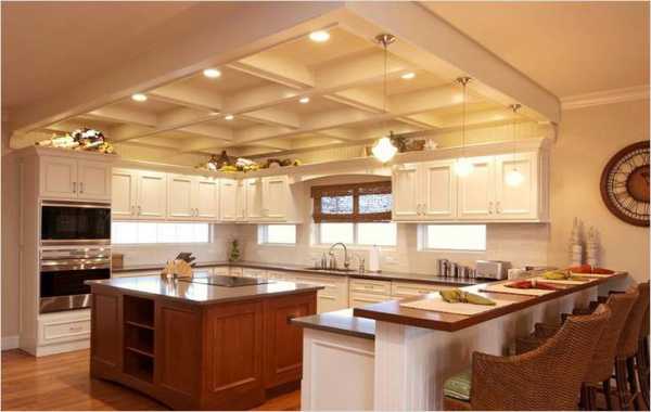 Совершенно иное решение требуется для монтажа в кухне потолка из гипсокартона фото, которого позволяет убедиться в его практичности. Во-первых, такой потолок обеспечит достаточный уровень освещенности всего рабочего места, а во-вторых, умело играя с уровнями, вы легко добьётесь зонирования помещения. Кроме того, дополнительное освещение визуально сделает помещение более просторным, что весьма актуально для кухонь во многих многоквартирных домах.