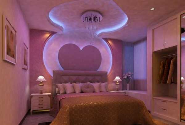 В основном весь дизайн «крутится» вокруг кровати. Обычно именно ее местоположение каким-либо образом отражается в конструкции гипсокартонного потолка. Так, над кроватью часто монтируют выступающий прямоугольный или овальный уровень с подсветкой, что привлекает внимание именно к спальному ложу и отвлекает внимание от других элементов интерьера, как бы объединяя их. Можно поступить противоположным способом – сделать нишу, соответствующую ширине кровати прямо над ней. В таком случае ее часто продолжают на стене, устанавливая в образовавшийся проем изголовье кровати.