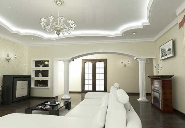 Возможны вставки точечных светильников и даже светодиодной подсветки между уровнями. Белый цвет, играющий главную роль в оформлении потолка, визуально расширит границы зала, придаст обстановке нотку торжественности. Всё это при относительно небольших затратах создаст впечатление добротности и богатства.