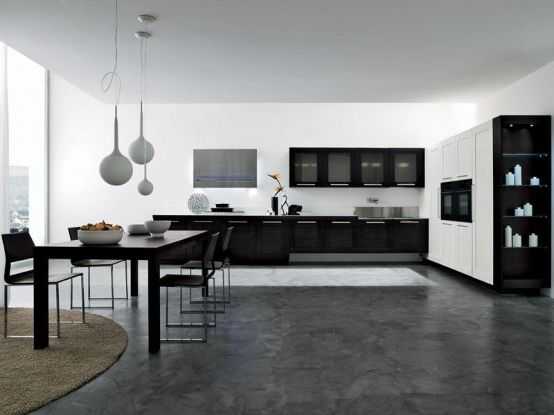 На поверхность пола можно установить маленький подиум для круглого обеденного стола и прикрепить светильник на регулирующемся шнуре к подвесному потолку. Этот способствует визуальному расширению пространства в кухне.