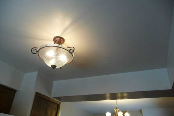 По завершении обшивки на кухне, стыки между листами нужно тщательно зашпаклевать. Первый слой швов следует оклеивать бинтом-серпянкой. После окрашивания поверхности вы получите идеально гладкий потолок. (Фото ниже).