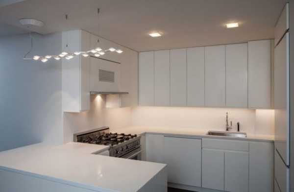 Сделать вытяжку и убрать все некрасивые элементы в короб – лучший вариант- Возможно понижение всего периметра, а центральная зона в данном варианте остается на прежнем уровне. Это оптимальное решение для ценителей симметрии. Те области, которые снижены по высоте, становятся зоной расположения точечных светильников. Для подсветки используются и неоновые ленты.