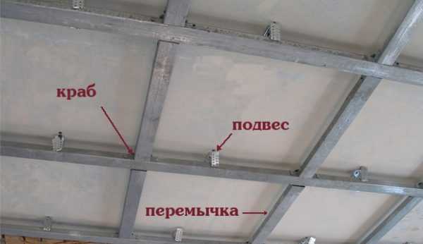 При необходимости между несущими профилями установить поперечные перемычки. Шаг установки – 40 см. Соединяют их с профилем «крабами». Профиль крепится к подвесам саморезами.