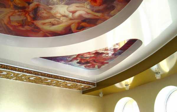 Можно превратить простой потолок в шедевр, если украсить его объемными рисунками. Их можно создать самостоятельно – и это несложно. Нанеся на поверхность выбранный узор, с помощью жидкой бумаги делаем его прорисовку и высушиваем. После этого листы гипсокартона укрепляются на выбранные места и окрашиваются обычным образом.