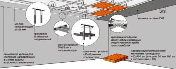 Схема обустройства подвесного потолка с использованием металлических профилей, гипсокартона и утеплителя
