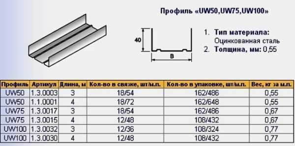 - UW-50, 75, 100. Число в маркировке обозначает ширину рейки. Такой профиль предназначен для установки в качестве основания под стойки, при сборке каркаса стен и различных простенков. Ширина 50, 75 или 100 мм, высота полок стандартна для всех видов – 40 мм, длина 3000-4000 мм, толщина стальных стенок 0,5-0,6мм. А также имеет антикоррозионное покрытие из цинка.