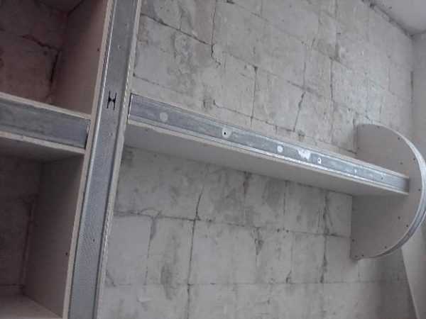 Пример стоечной рейкиЧтобы добиться большей плотности крепления, монтаж гипсокартонных листов выполняют в одном направлении с открытой частью стойки. На обоих концах профиля имеются специальные отверстия, позволяющие монтировать коммуникации внутри конструкций.