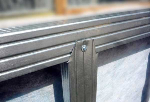 - Стойки вставляют в направляющие, с последующей фиксацией концов реек саморезами.