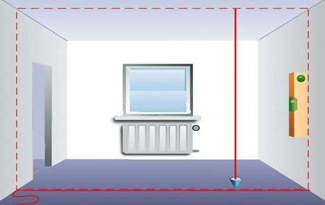 Для этого от поверхности ближайшей стены откладывается необходимое расстояние, после чего по полу проводится основная линия.