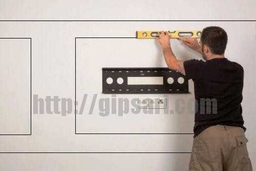 Затем переносим разметку на стену. Ниша, в которой будет находиться телевизор, должна быть на 5-10 см. больше по всему периметру. Это делается для того, что бы улучшить циркуляцию нагреваемого воздуха, при работе телевизора и для удобства его навешивания и обслуживания. Высоты и дополнительные ниши всей конструкции выбираются индивидуально.