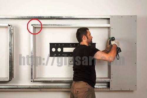Лист закрепляется к металлическому каркасу при помощи саморезов размером 3,5*35 миллиметров. Сначала закрепляют края листа, а затем по краям по средней линии, применяя специальную маркировку, отмечающую положение шурупов каждые 25 сантиметров. Расстояние между саморезами может колебаться в пределах 10-25 сантиметров, но не больше. Саморезы необходимо вкручивать так, чтобы их шляпки не торчали над поверхностью стены, слегка углубившись в гипсокартонный лист.