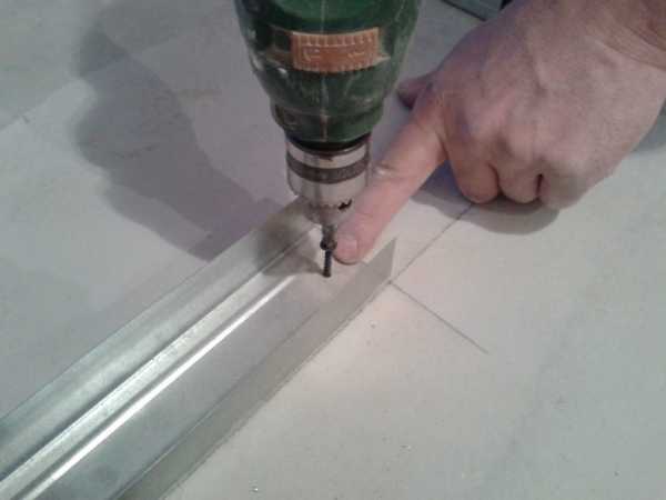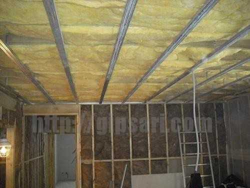 Когда монтажные работы стенового каркаса закончены, можно переходить к установке каркаса на потолке. Работа проводится точно в такой же последовательности, как и при установке каркаса на стены, разница только в том, что направляющие необходимо прикреплять не к стене, а к стеновому каркасу. Кроме этого, для обеспечения потолочной конструкции, нужно дополнить каркас перпендикулярными вставками основного профиля.