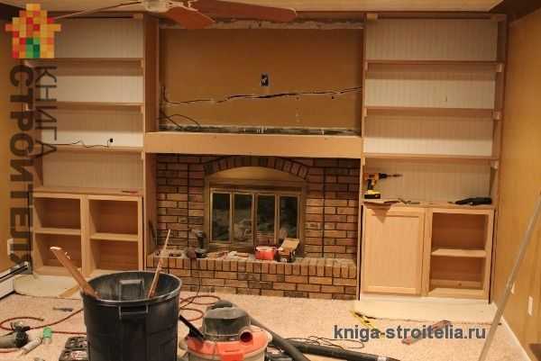 Более подробно о том, как осуществляется монтаж панелей для отделки стен рассказано в перечисленных статьях: Панели стеновые. Виды, особенности. Фото , Стеновые панели. Выбор и монтаж своими руками , Пластиковые панели , Отделка стеновыми панелями , Ламинированные панели. Michail Rybakov Далее к стенкам крепятся полоски из деревянного бруса. Они будут выполнять функцию держателей полок. Нижние тумбы изготавливаются из клееной широкой доски, если же используется ДСП или фанера, то вырезают детали нужного размера. («Дсп в интерьере. виды и способы обработки» , «Возводим подиум. фото в интерьере» , «Библиотека своими руками с кабинетом и гостевой. » )
