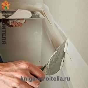 На стыки накладывается малярная армирующая сетка и уже сверху наносится шпаклевка. Углы укрепляются пластиковыми или металлическими профилями — уголками, которые фиксируются покрывающим их слоем шпаклевки. Места углублений от саморезов выравниваются нанесением небольшого слоя раствора. После затвердевания и высыхания шпаклевки все места ее нанесения шлифуются наждачной бумагой и вновь покрываете все грунтовкой. 16, 17, 18) Michail RybakovПосле затвердевания и высыхания шпаклевки все места ее нанесения шлифуются наждачной бумагой и вновь покрываете все грунтовкой