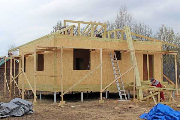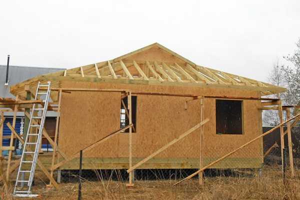 Дом с полувальмовой крышейВозведение кровли производится в несколько этапов: