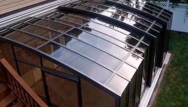 Такая конструкция чаще всего требует применения профессионально выполненных подвижных арочных деталей, системы роликовых или скользящих опор. Сделать подобный вариант раздвижной крыши вполне по силам своими руками, например, для схемы, изображенной на фото. Изготовление более сложных конструкций со скользящими арочными или настильными панелями лучше доверить профессионалам.