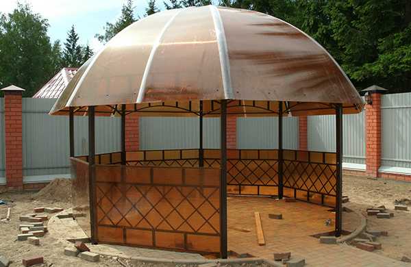 Не менее популярным принято считать использование поликарбоната в качестве материала для возведения самых разнообразных крытых построек, вынесенных от несущих стен здания. Например, крытая поликарбонатом беседка или шатер для отдыха в летний зной, в отличие от предыдущих схем, рассчитываются и строятся с обязательным обустройством собственной фундаментной системы. Даже для такой простой конструкции, как качели с крышей из поликарбоната, необходимо предусмотреть столбчатый или мелкозаглубленный фундамент.