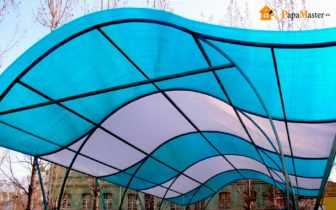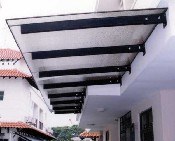 Поэтому лучше материал подходит для не длинных скатных или арочных вариантов навеса над террасой или над крыльцом, закрепленных на алюминиевом каркасе или стальном каркасе из профилированной трубы.