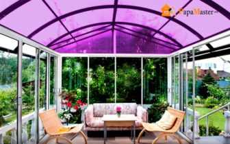 Желаемый уровень освещенности террасы и веранды следует выбирать на стадии проекта. Кроме прозрачного материала в продаже есть рифленый, матовый и цветной материал, существенно понижающий уровень инсоляции.