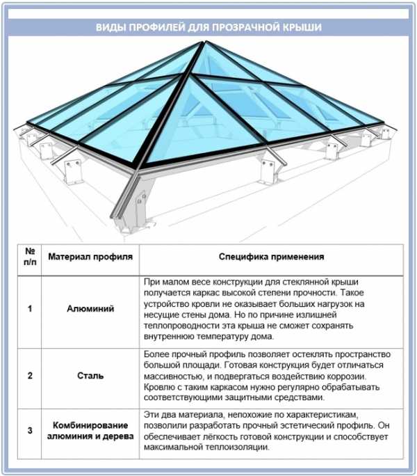 Профильная система, на которую будет установлена стеклянная прозрачная крыша, может быть выполнена из разных материалов.