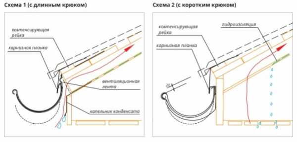 - Чтобы при сходе снега с кровли водосток не был поврежден, рекомендуем монтировать первый крюк на лобовую доску так, чтобы внешний край крюка был ниже воображаемой линии продолжения карнизой доски на 20 мм (схема 2)