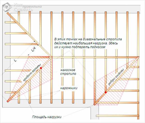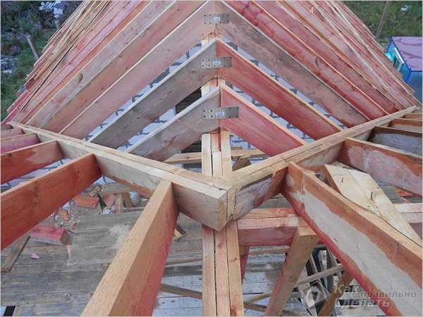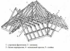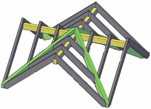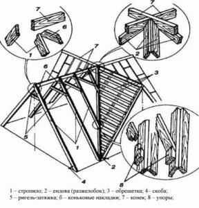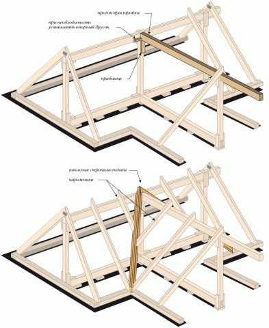 В случае вальмовой и полувальмовой кровли в местах соединения скатов устанавливаются диагональные стропильные ноги. На эти элементы приходится основная нагрузка, поэтому они требуют усиления нарожниками. Такие стропила можно изготавливать сдвоенными, соединенными из двух досок 150×50 мм. Стропильные ноги, усиленные подкосами и ригелями, образуют фермы. Чтобы обеспечить привлекательный вид многощипцовой кровли и необходимую жесткость конструкции, все детали ферм изготавливаются шаблонно. Начинающие строители могут собирать фермы не с помощью врубки, а скрепляя их накладными металлическими элементами.