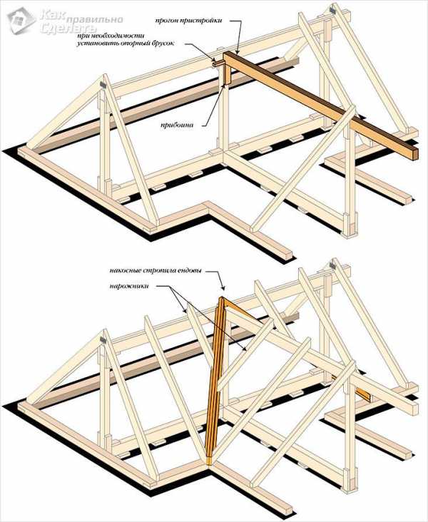 Большое количество различных типов многощипцовых крыш не позволяет определить единую систему для монтажа. Способы соединительных узлов бывают простыми или сложными.