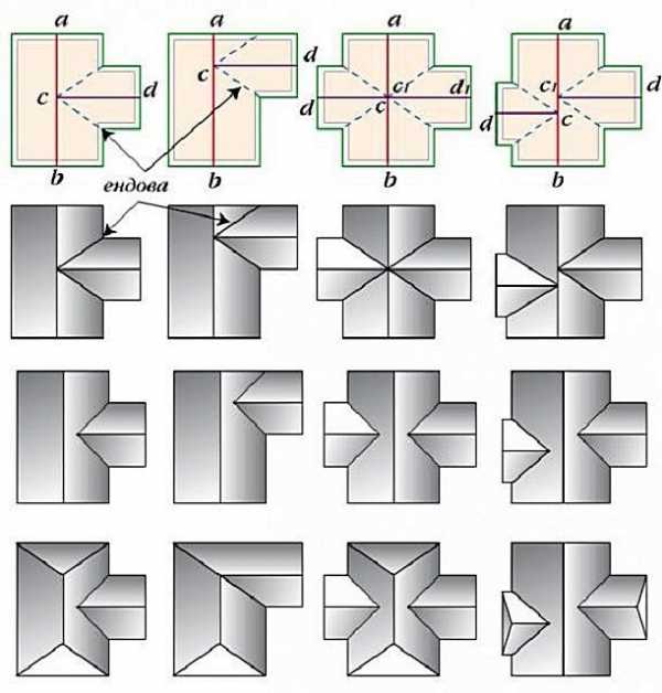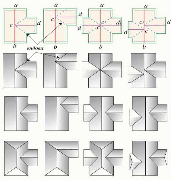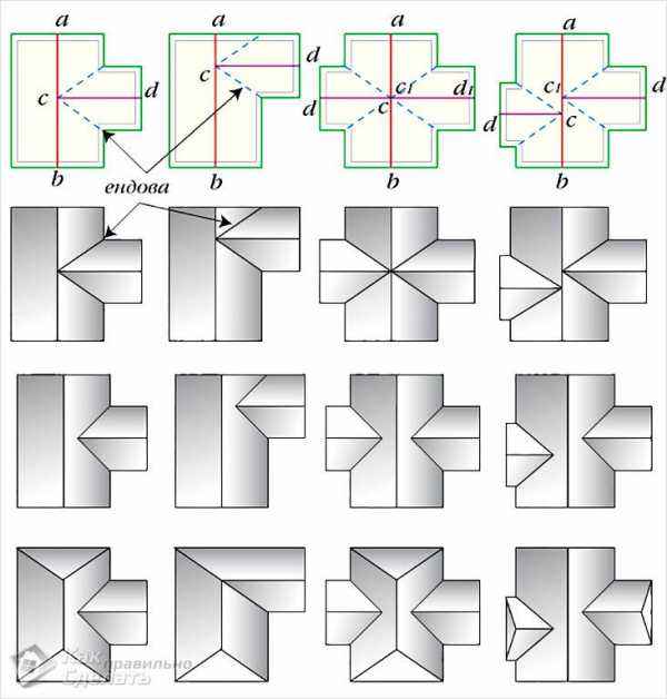 Если здание выполнено в форме буквы «П», «Г», «Т», то в таком случае может быть использована только многощипцовая крыша. Эффективным вариантом для избавления от фронтонов служат вальмовые скаты.