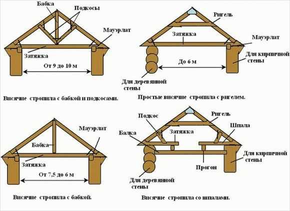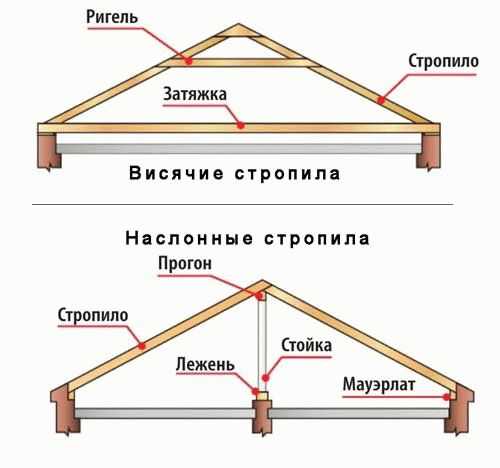 Стропила в двускатной крыше бывают висячими или наслонными. Первые не направляют нагрузку на несущую конструкцию из-за отсутствия опоры. Второй тип стропил имеет опору – прогон, устанавливаемый на вертикальных стойках.