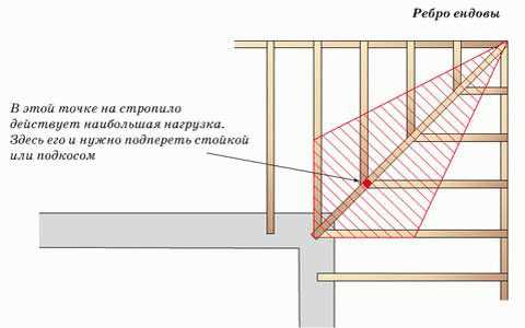 Ендова – место внутреннего соединения скатов, они являются одним из ключевых узлов. Им приходится выдерживать существенную нагрузку от скопления снега, поэтому снизу выполняется поддержка из системы подпорок и подкосов. Гидроизоляция узла имеет огромное значение, по ендовам проходит вся стекающая по кровле вода. Любая ошибка конструкции обернется протечкой.