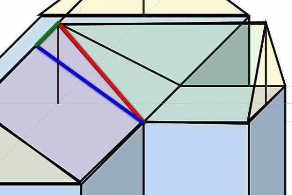 Красная линия – гипотенуза, а синяя (длина стропилы основного здания) и зеленая (1/2 ширины пристройки) – катеты. Расчеты ведутся при использовании теоремы Пифагора.