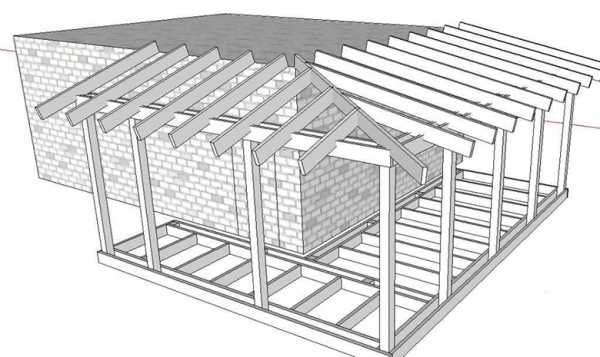 При сборке каркаса веранды смотрите, чтобы кровля пристройки точно подходила к кровле основного здания.