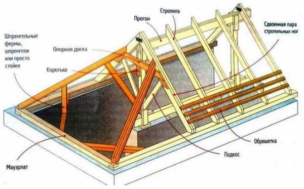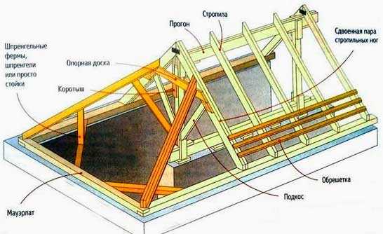 Остов трехскатной крыши имеет следующие составляющие: