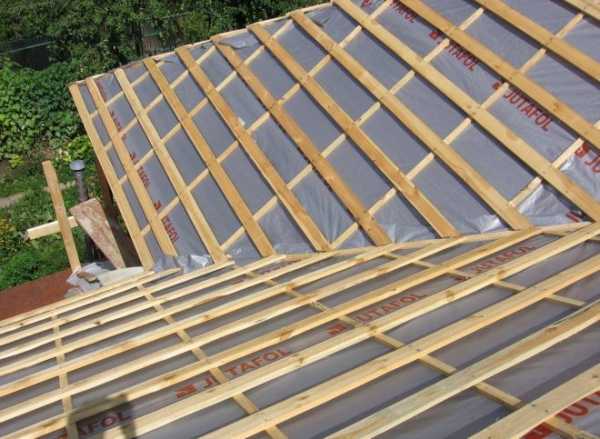 - Создаётся гидроизоляционный слой. Для этого рулон изоляционной плёнки раскатывается на ровной поверхности и нарезается полосками нужных размеров. Затем плёнка крепится к стропилам строительным степлером так, чтобы каждый последующий слой на 10–15 см накладывался поверх предыдущего.
