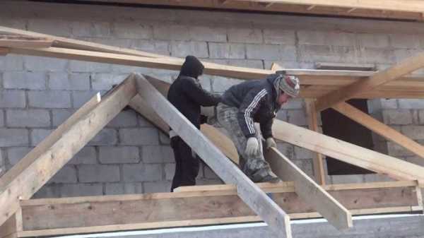 По имеющемуся шаблону изготавливают нужное количество стропил, прикрепляют их коньковому брусу, затем устанавливают по месту и делают запил снизу на каждой стропильной ноге и к мауэрлату. Стропильные ноги устанавливают на мауэрлат возле балок перекрытий так, чтобы была возможность соединить конструкцию шпильками. Это нужно для увеличения жесткости стропильной фермы; при этом расстояние между стропил равен расстоянию между балок перекрытия.