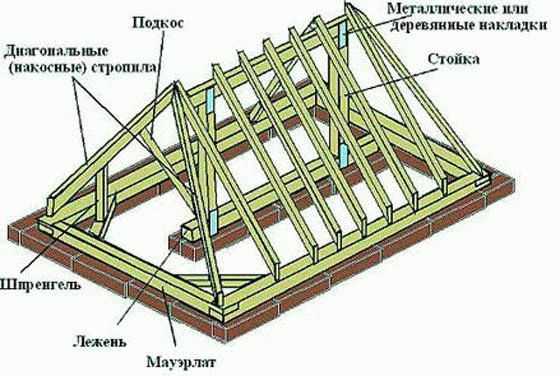 Накосные стропила прикрепляют с помощью уголков и накладок, для крепости соединения стропила укрепляют нарожниками – подпорками, которые образуют вальмовый скат и упираются снизу на мауэрлат, а сверху на накосные стропила.