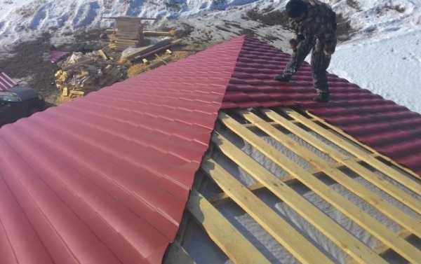 - Если длина ската крыши менее 6 м, то можно настилать материал сплошными листами, избегая горизонтальных нахлестов. Если же длина ската превышает 6-7 м, то придется резать листы поперек и собрать покрытие крыши в два ряда с горизонтальными нахлестами, чего желательно избегать.