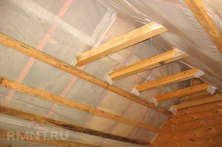 Как монтировать пароизоляцию. Между или под стропилами монтируем теплоизолирующий слой. Под ним натягиваем пароизоляционную пленку. Ее монтаж необходимо начинать снизу, полотнами во всю длину помещения. Следующий ряд делается с нахлестом 100–150 мм. Шов проклеивается клейкой лентой. Крепится пленка строительным степлером к нижней плоскости стропил или к специальной обрешетке. Двигаясь вверх, доходим до конька, там, не разрезая полотно, переходим на следующий скат. Пароизоляционная пленка работает только в одну сторону, поэтому при покупке заранее поинтересуйтесь, какой стороной ее необходимо монтировать. Работы по утеплению и пароизоляции можно проводить в последнюю очередь, после монтажа самой кровли.