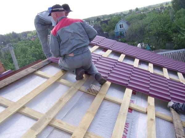 Все-таки черепица металлическая, и в случае повреждения нижнего защитного слоя из-за воды может подвергнуться коррозии. Так или иначе, какое-то количество влаги под черепицей всегда будет. Чтобы она там не скапливалась, необходимо продумать вентиляцию пространства под черепицей. Проще всего это сделать, набив вдоль стропил прямо по гидроизоляционной пленке бруски сечением 25х50 мм — спадающие бруски. По ним будут идти доски обрешетки. Если расстояние между верхней плоскостью теплоизоляции и верхней плоскостью стропил не меньше 30 мм, то при использовании универсальной пленки можно обойтись без спадающих брусков. Для этого гидроизоляция натягивается, обходя сверху стропила, и крепится на 30 мм ниже верхней их плоскости с необходимым провисом. Таким образом, полученные зазоры 30 мм между утеплителем и гидроизоляцией и, если необходимо, 25 мм между гидроизоляцией и нижней плоскостью обрешетки, обеспечат достаточную вентиляцию подкровельного пространства.