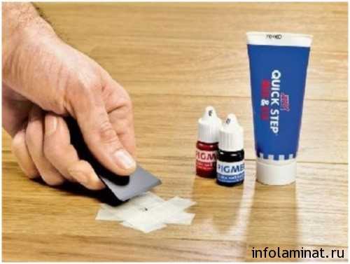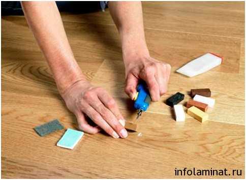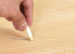 Их применяют для устранения более глубоких царапин и сколов. Цветовой тон этого материала следует подбирать внимательнее, он должен точно соответствовать рисунку ламели. Дополнительным инструментом является пластиковый шпатель, который можно приобрести в том же строительном магазине.