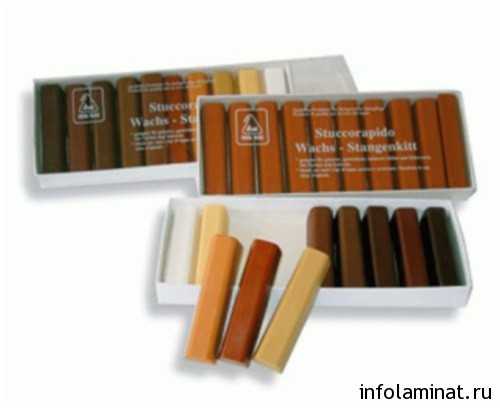 Чтобы устранить самые простые мелкие царапины, можно воспользоваться специальными восковыми карандашами. Многообразие различных цветов, позволяет беспрепятственно подобрать подходящий к ламинату оттенок.