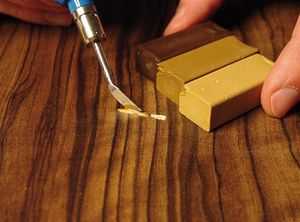 Расплавить и нанести состав шпателем. Растопленная шпаклёвка очень скоро застывает, и всё надо делать очень быстро, но аккуратно. Поверхность следует разравнивать сразу при нанесении. Если остались острые выступы или выпуклости, то после затвердения их можно выровнять шлифовальной бумагой № 0.